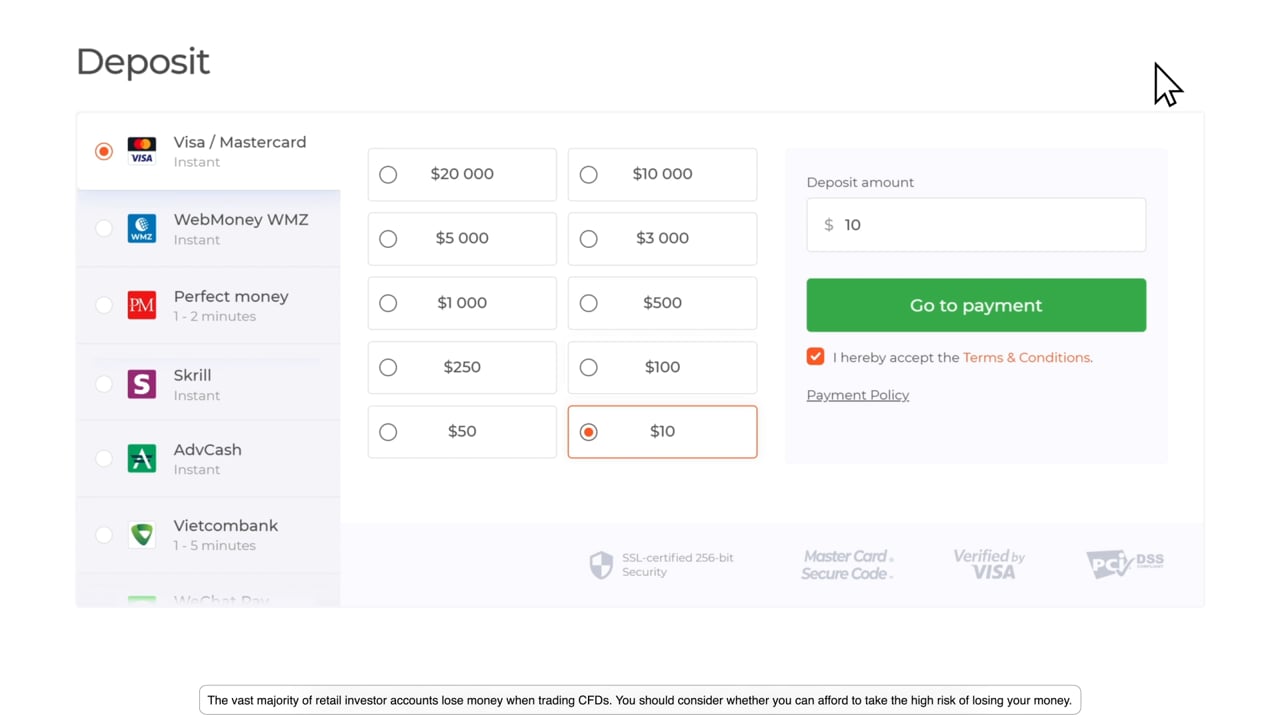 “The financial products offered by the company carry a high level of risk and can result in the loss of all your funds. You should never invest money that you cannot afford to lose”